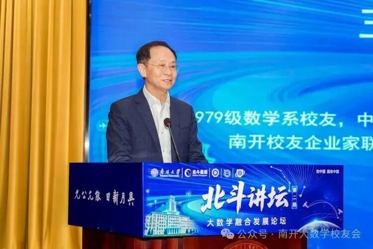 杨庆山代表南开大学向长期以来关心、支持学校发展的各界人士表示感谢。他高度评价了大数学校友们在人才培养、科技创新、成果转化、学生就业等方面的鼎力支持,希望数学校友分会继续扎实践行“服务校友、服务母校、服务社会”的宗旨和“大南开”发展理念,筑好“校友之家”和“沟通之桥”,吸引更多校友回到南开、支持南开,为深化南开理工学科升级建设持续注入新动能,同时将“北斗讲坛”打造成为汇聚学术智慧与产业前沿的标杆性平台,为中国式现代化建设贡献南开智慧、提供南开方案。