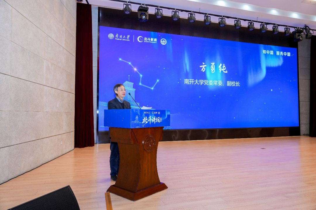 方勇纯代表学校向长期以来关心、支持南开大学发展的各界人士表示感谢。他高度评价了周儒欣校友带领北斗星通积极服务国家战略、深耕卫星导航产业取得的一系列突出成果。他说,数学校友分会是连接南开与大数学学科校友的重要桥梁,希望以“北斗讲坛”为纽带,推动北斗产业与人工智能深度融合,持续不断深化南开“新工科”建设,促进“校友生态”融合,吸引更多校友回到南开、支持南开,为中国式现代化建设贡献南开智慧、提供南开方案。