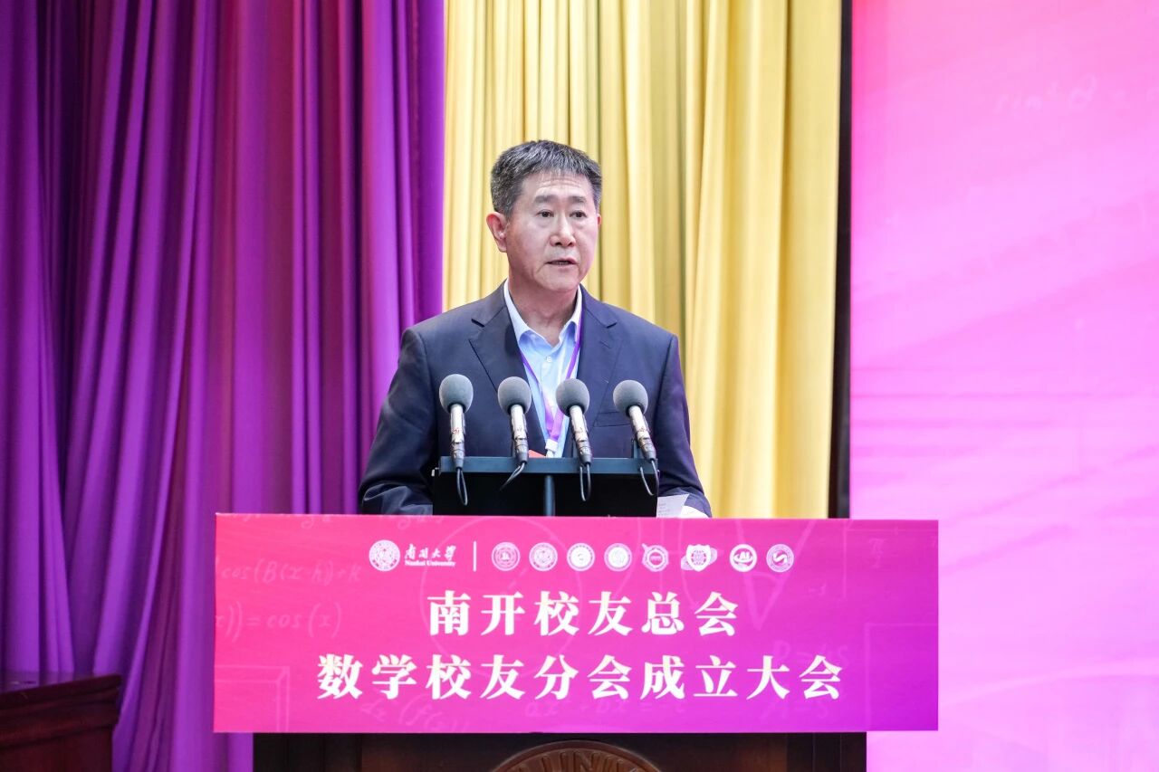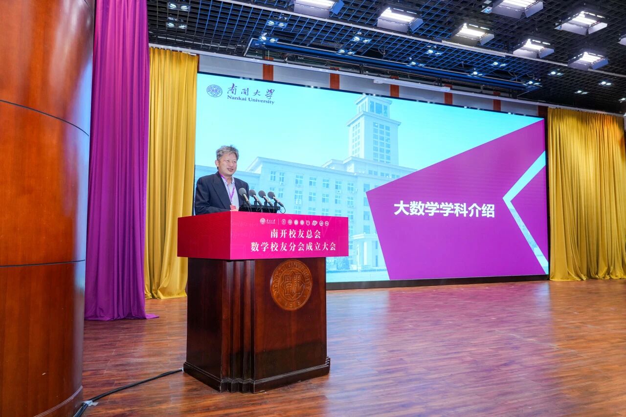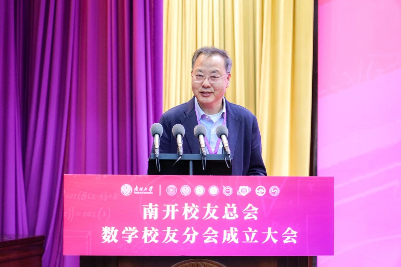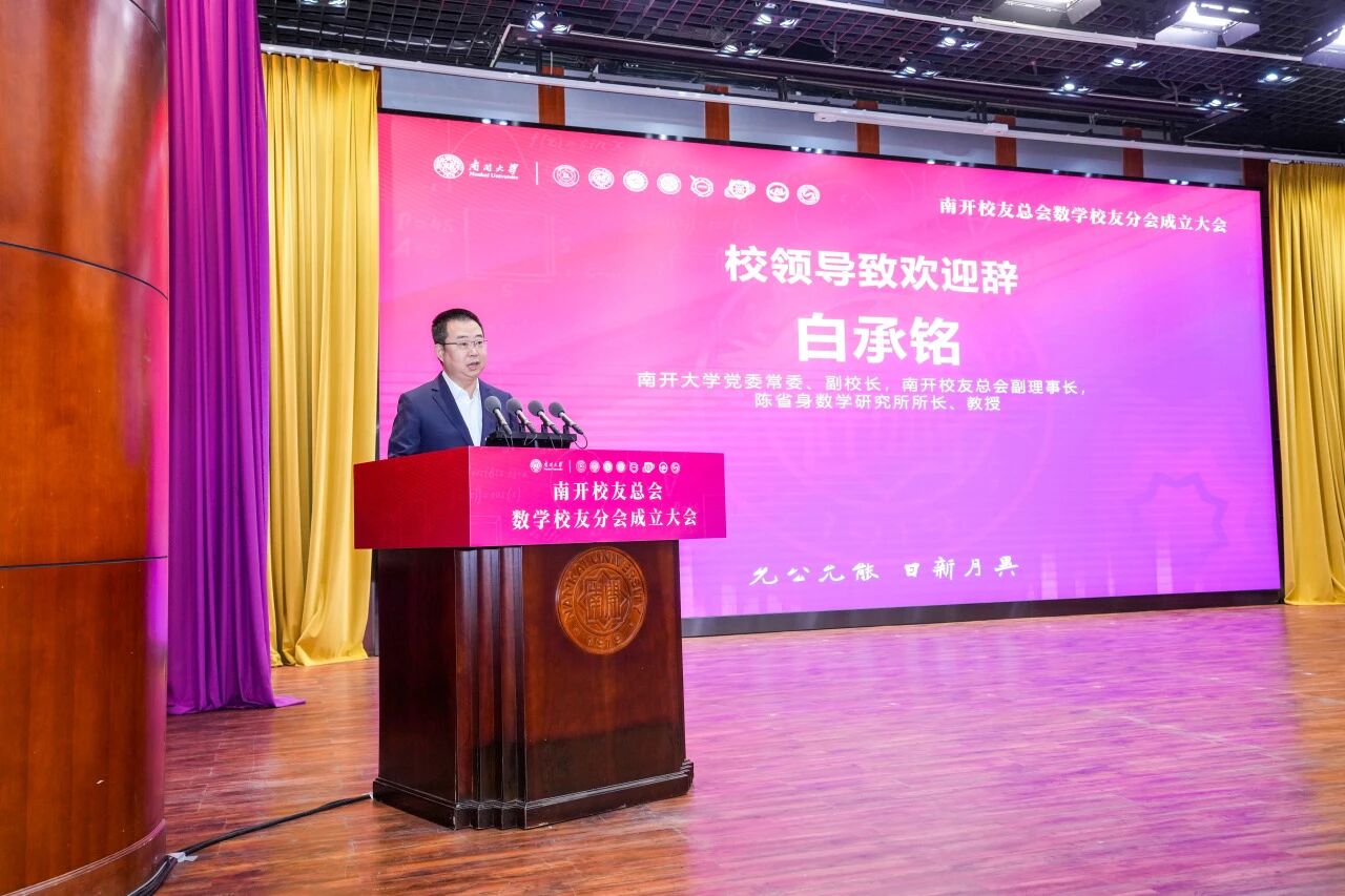 白承铭在致辞中代表学校对分会成立表示祝贺,他说,南开数学底蕴深厚,自姜立夫先生创系以来,历代学人承前启后、薪火相传,形成了严谨治学、爱国奉献的优良传统。数学校友分会的成立,是凝聚全球校友力量、推动学科高质量发展的重要举措。希望分会充分发挥“纽带”作用,推动校企合作、校地合作、国际交流,支持学科建设、人才培养与科研创新,形成“校友反哺学科、学科成就校友”的良性循环,引领广大师生校友,聚焦国家重大需求,瞄准“卡脖子”问题中的数学基础与关键技术,开展有组织、有深度的科研攻关,为建设教育强国贡献南开数学人的智慧与力量。
