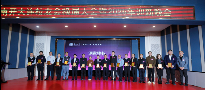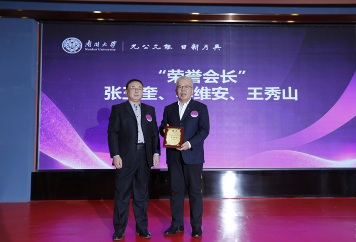 大会特设荣誉会长,张玉奎、李维安、王秀山三位校友获此荣誉。1960级化学系校友、中国分析化学领域泰斗、中国科学院院士张玉奎,因另有会务未能到场,通过视频连线向大会表示祝贺,并对校友会未来发展寄予厚望。他深情回忆了在南开求学的岁月,表示母校严谨的学风与师长的谆谆教诲为其科研道路奠定了坚实基础。他特别感念化学系理论与实践结合的培养模式,以及同窗间相互启发、踏实进取的氛围。他寄语年轻校友传承南开精神,在各自领域勤勉深耕,服务社会。1985级经济学专业校友、东北财经大学原校长、南开大学讲席教授李维安于2010年任大连校友会会长。崔长军会长现场为1990级图书情报学专业王秀山校友颁发聘书。